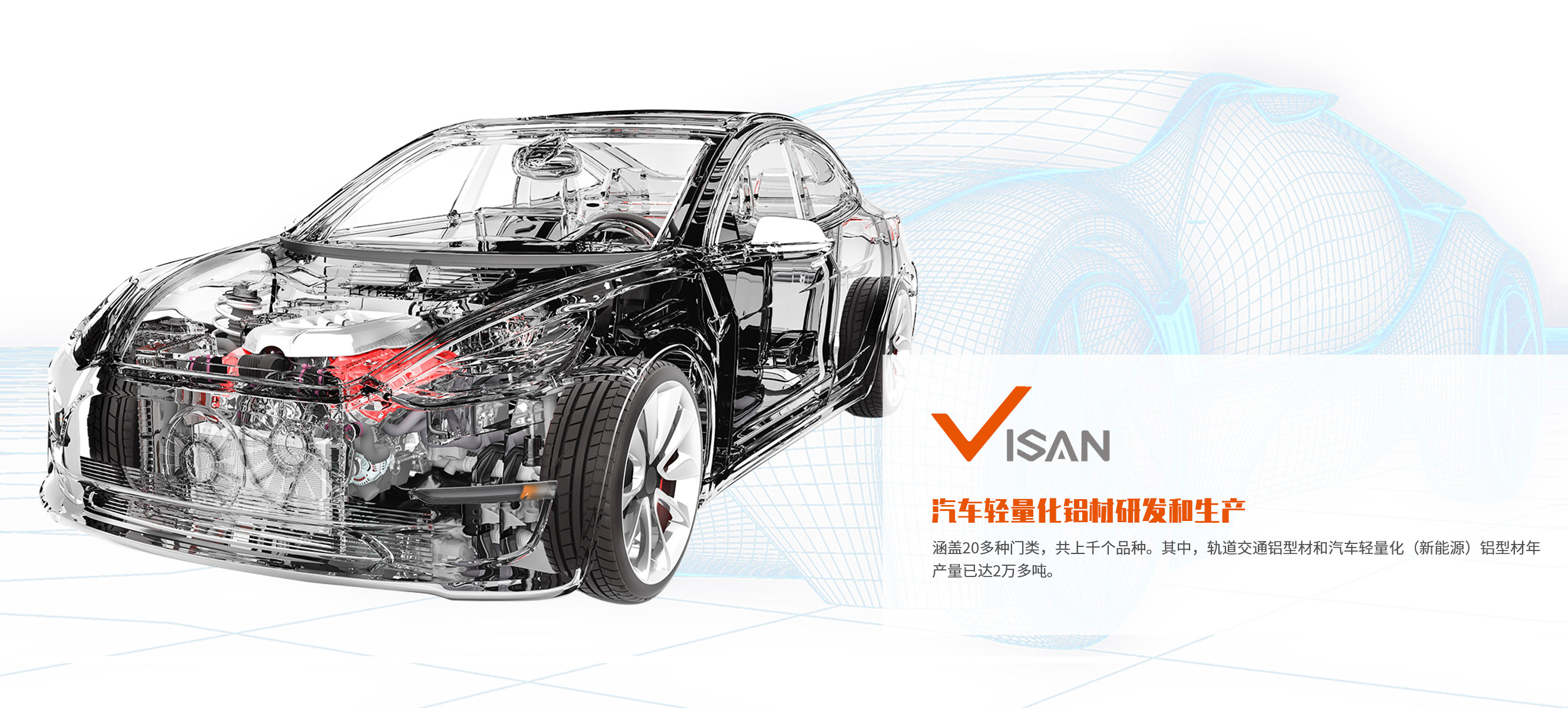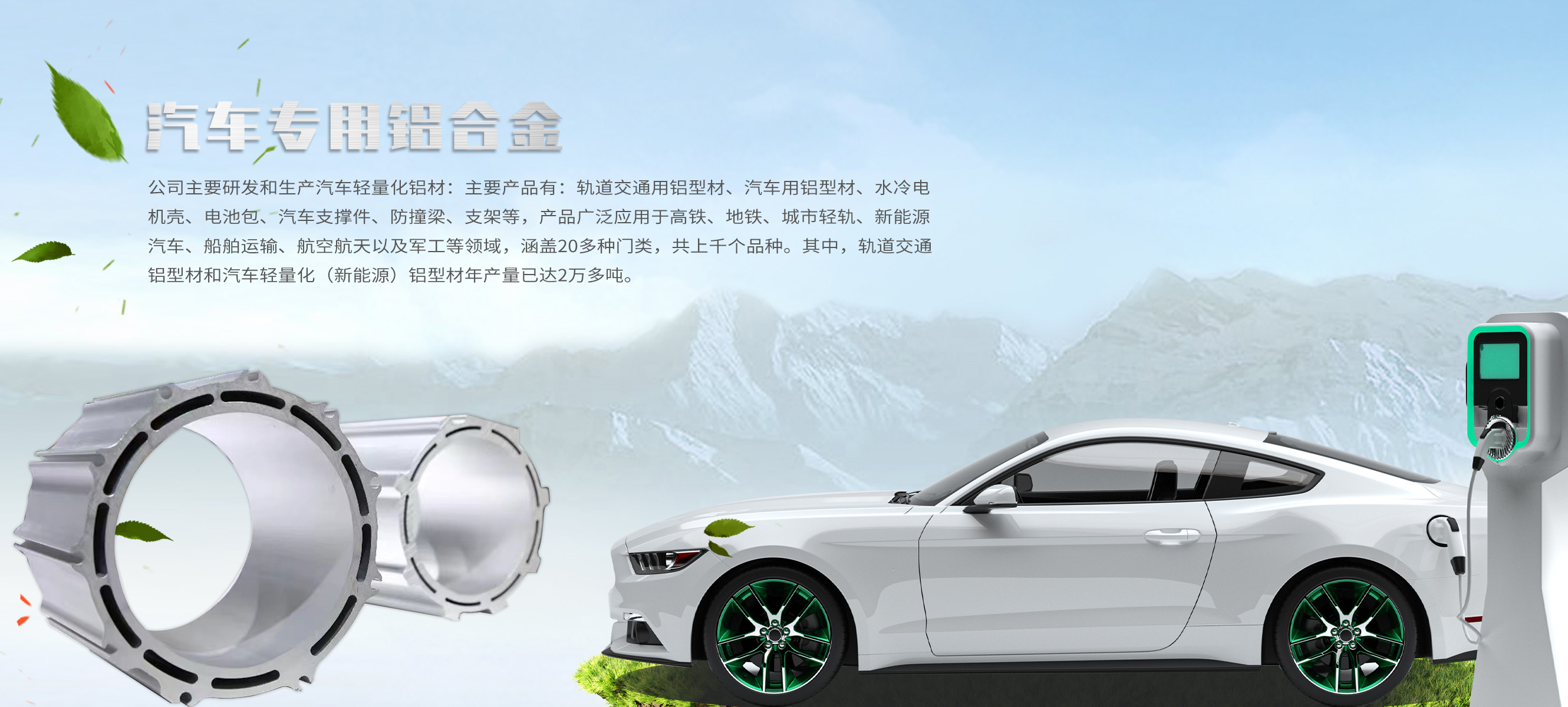 主要产品有:轨道交通用铝型材、汽车用铝型材、水冷电机壳、电池包、汽车支撑件、防撞梁、支架等,产品广泛应用于高铁、地铁、城市轻轨、新能源汽车、船舶运输、航空航天以及军工等领域,涵盖20多种门类,共上千个品种。其中,轨道交通铝型材和汽车轻量化(新能源)铝型材年产量已达2万多吨。